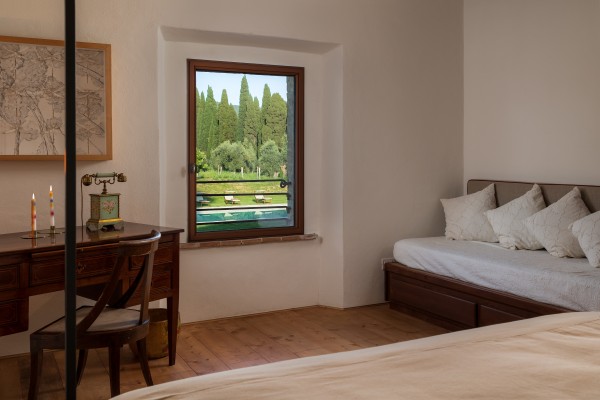 The common areas of Il Paretaio, such as the large dining room and the living room with the main fireplace, are wide open and have large windows overlooking the garden; the kitchen is equipped with all comforts and next to it, the old “Carraia” has been transformed into a living room with a cozy fireplace. From there, you can access the outside where there is a dining table and a wonderful stone barbecue, completely independent and an outdoor area that allows you to enjoy the garden even on rainy days! Also, next to the kitchen, a study / leisure room has been created with access to a splendid small Hammam with steam bath. But of Il Paretaio, the thing that strikes the most are the large spaces, the windows that make you feel immersed in nature and in every room offer breathtaking glimpses and views of the surroundings. It is a farmhouse that was designed and renovated with pure love for the area and for the ancient architectural features of Bolgheri.