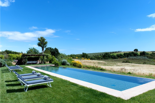 Just a one-hour drive from the city of Rome halfway down the Italian peninsula, a delightful nine hectare plot planted with lavish Mediterranean gardens, the front lawn leading down to an exclusive 20m salt-water infinity swimming pool with a swim jet system situated on a lower terrace with views out towards the sea. The house is surrounded by pergolas and covered terraces, stylishly furnished with breakfast and dining table seating 16 guests, comfortable sofas perfect for sunset cocktails.