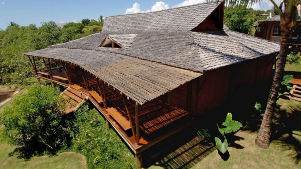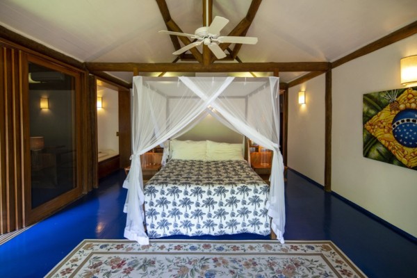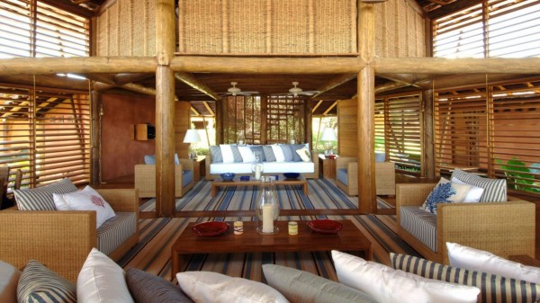 San Marcos’ grand and impressive safari-style structure is made entirely out of wood and seamless glass, effortlessly achieving a natural yet chic contemporary beachfront villa. The house’s split levels of open walkways, decking and terraces give it superb views of the beach and headlands without compromising its privacy. The bedrooms are simple, elegant but cosy with poster-beds swathed in sheer cotton awnings, nautical blue and white linen, shuttered sides and all have air conditioning and ceiling fans. Pristine gardens encircle the property and there’s a wooden bridge over a small river from the sitting area to the pool, where sunbeds are lined up to attention and there’s only a row of palms between you and the sandy surf. Hammocks drape themselves lazily between balcony pillars and large, inviting rattan sofas sit squarely whilst ceiling fans chop silently through the air above.
